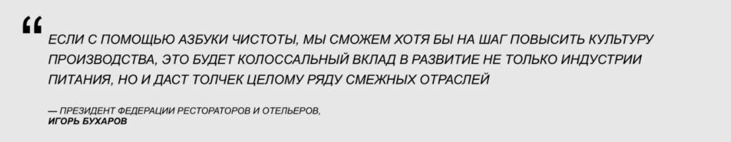 Практические решения проекта формируют базовую привычку - ПРИВЫЧКУ ЧИСТОТЫ, без которой не может существовать даже самое модернизированное предприятие. Проект растет, постоянно анализируются новые проблемы в индустрии питания, производстве и продаже продуктов. Ассортимент пособий постоянно расширяется, а информационное наполнение постоянно актуализируется в соответствии с Российским и международным законодательством.